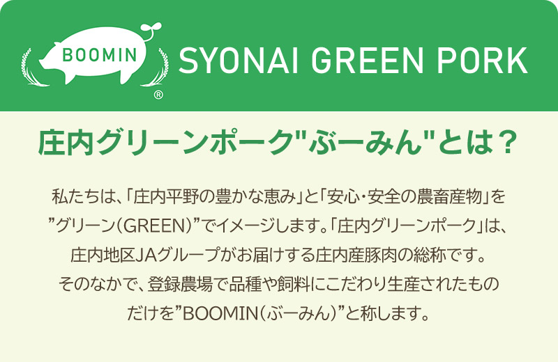 材料に使用している「庄内豚(庄内グリーンポーク“ぶーみん”)」は、登録農場制による山形県庄内地方限定生産の豚肉です。