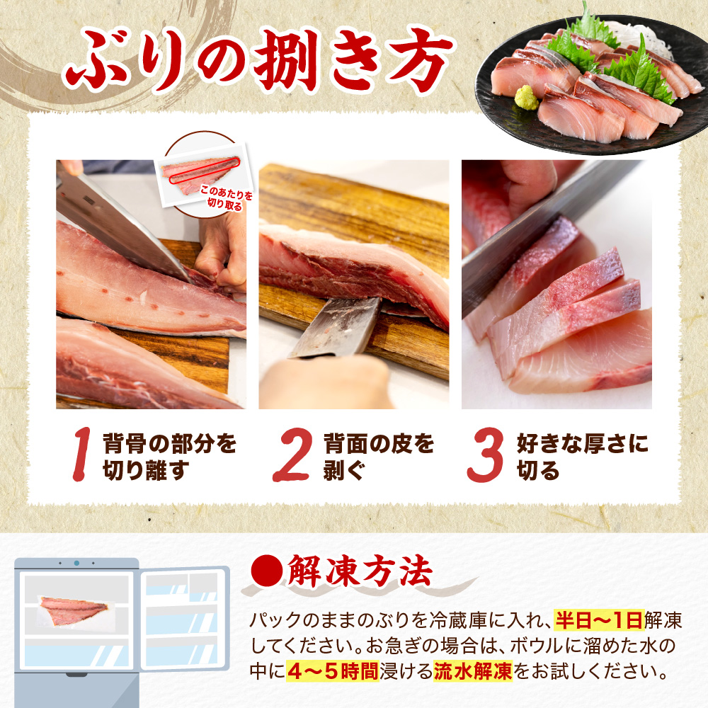 日高沖で獲れた船上活〆のぶりを半身にしてお届け。