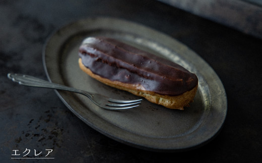 エクレア・・・・・濃厚だけど後味はさっぱりとしたカスタードクリームは、国産小麦粉を使って作った味のあるシューと相性ばっちり。ビターチョコがアクセントに。チョコレートは乳化剤不使用でオーガニックチョコレートを使用しております。