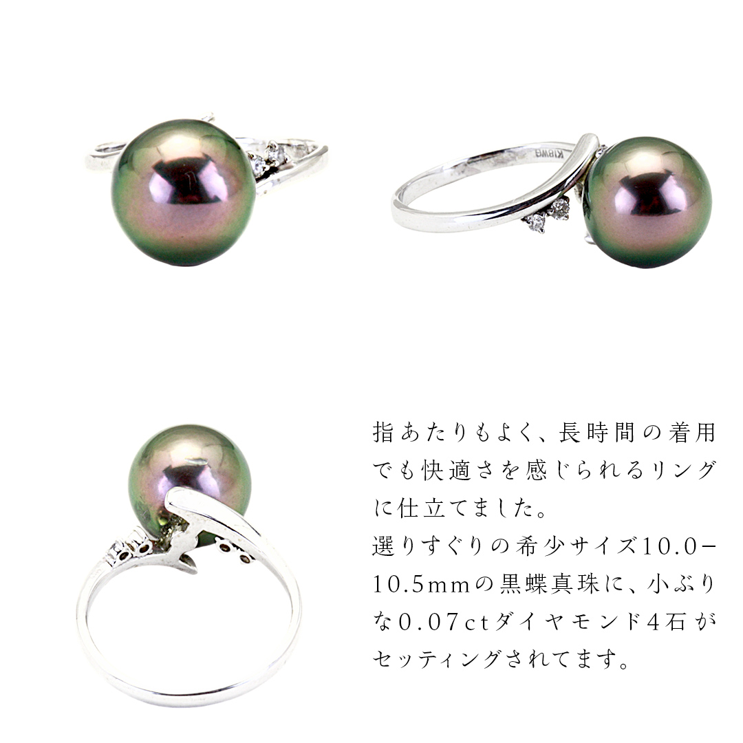 選りすぐりの希少サイズ10.0−10.5mmの黒蝶真珠に、小ぶりな0.07ctダイヤモンド4石がセッティングされてます。