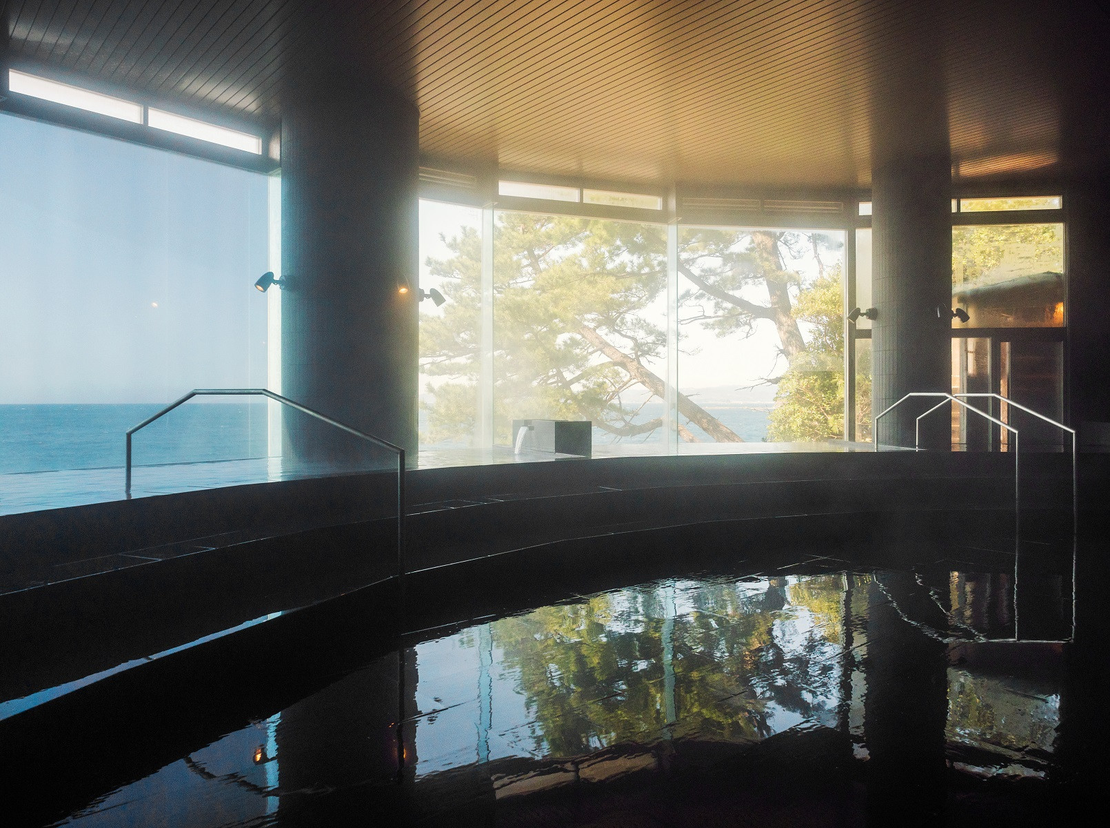 露天風呂「三段の湯」は深さ120cmの立ち湯に浸かりながら、眼前に広がる海と一体感のある湯浴みがお楽しみいただける開放的な露天風呂。