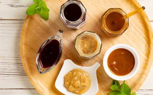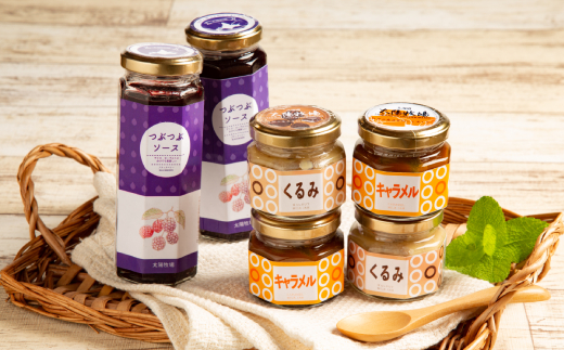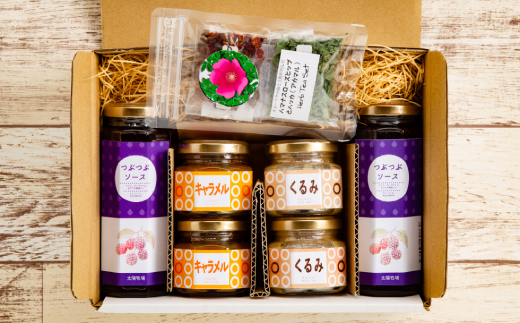 つぶつぶソース(ブラックベリー)160g×2、ミルクジャム(キャラメル)70g×2、ミルクジャム(くるみ)70g×2、ハーブティー(ハマナスローズヒップとハッカ)×1