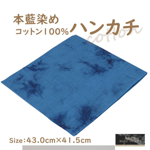 徳島の『阿波藍』で一枚いちまい丁寧に染められたハンカチは、小さなカバンやポケットに入れてもかさばらないサイズです。