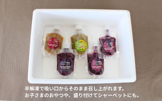 シャーベットでは、パウチをハサミで切って、スムージでは半解凍後に吸い口からお召し上がりください。