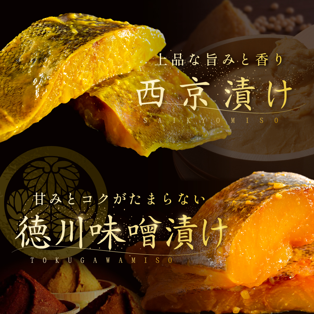 上品な旨味と香りの西京漬け、甘みとコクがたまらない徳川味噌漬けは焼くだけで料亭のような味わい。