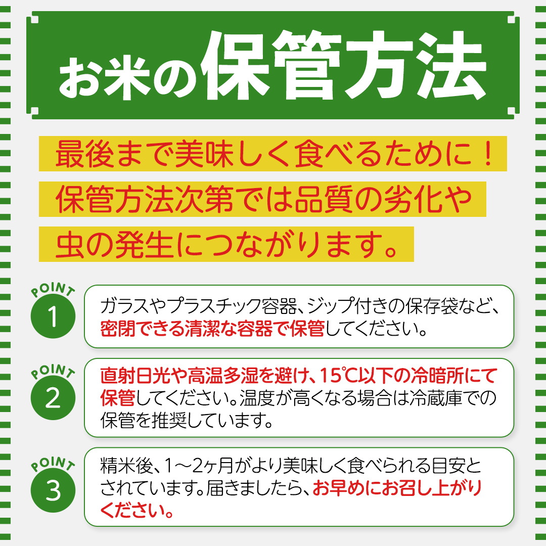 ※ご到着後は直射日光や高温多湿は避け、密閉した容器に移し替え15℃以下の冷暗所にて保管してください(冷蔵庫での保管をお勧めしています)米袋には通気口が開いております。特に気温が高い夏場は、虫が発生しやすいのでご注意ください。