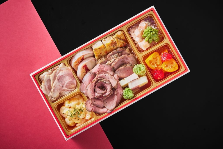 辰の重は、グローフーズ自慢のローストビーフや牛タンローストなどのお肉料理を中心に人気の「ぷちぷり海老サラダ」を詰めた洋風おせちで大晦日のカウントダウンに。