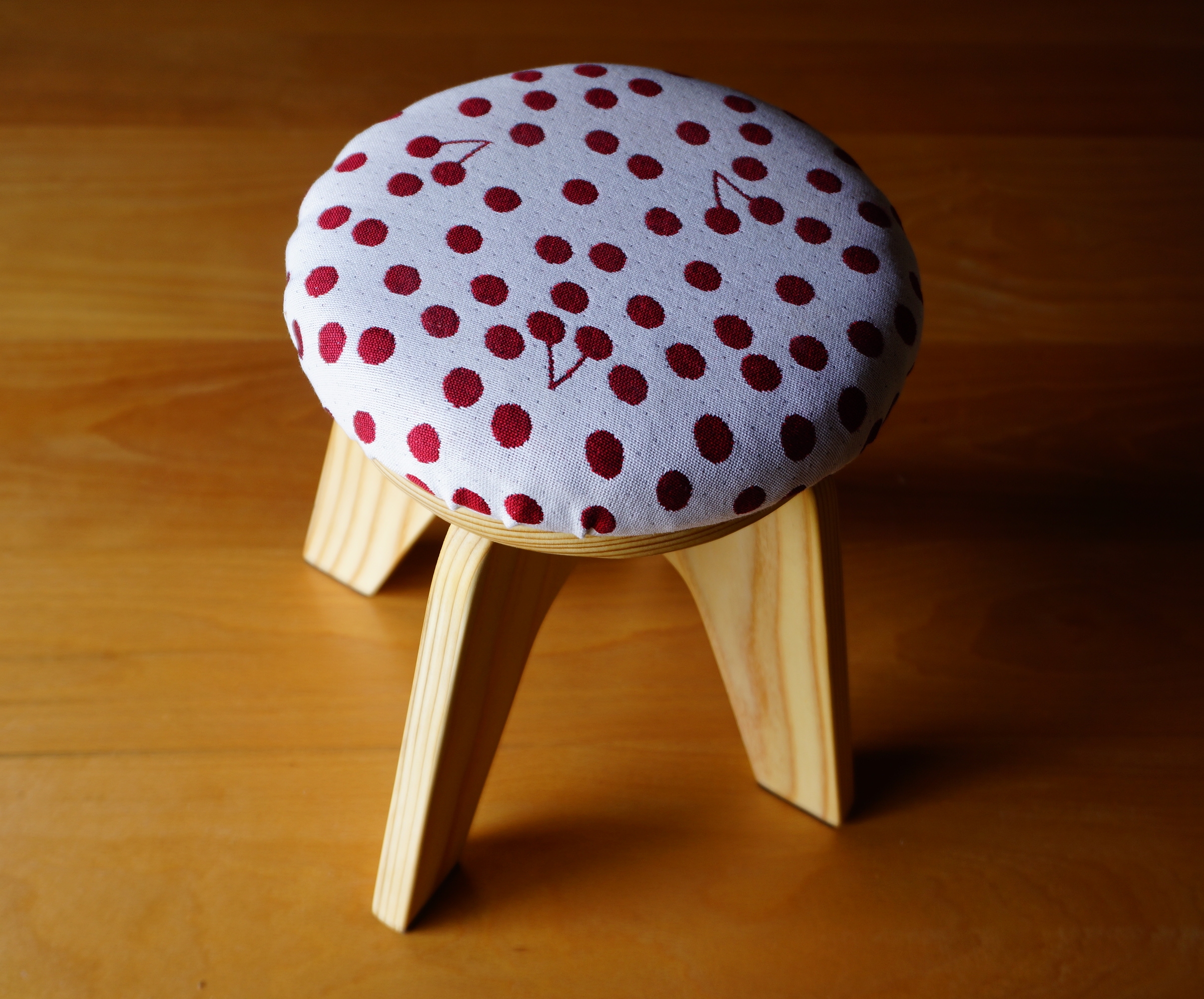 さくらんぼ柄の米沢織り小紋生地を張った小椅子です。
