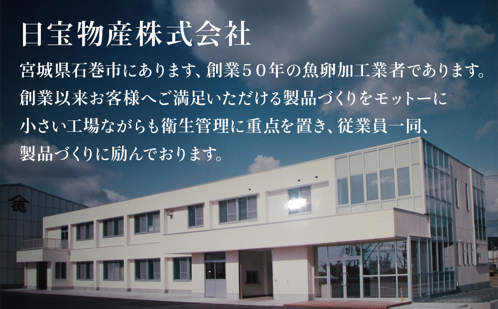 昆布だしベースにて二度の塩蔵、漬込みを行い、その後、卵の熟成に時間をかけた味わい粒立ち共に良質・高品質な「タラコ」です。