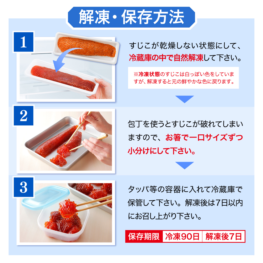 定置網で漁獲された鮮度の良い鮭の魚卵を、当社独自の製法で添加物を一切使わず塩だけで仕上げました。