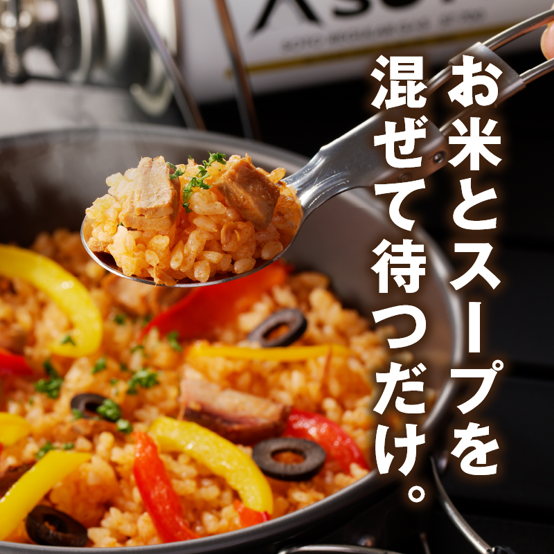 お米とスープを混ぜて待つだけです。常温で60分、スープの袋を湯煎すれば20分で出来上りです。フライパンやお鍋にお米とスープを入れて、火にかけ約5分ほど加熱しても美味しくいただけます。アウトドアやキャンプ、ご家庭の備蓄食や海外旅行・長期出張などにあると便利です。