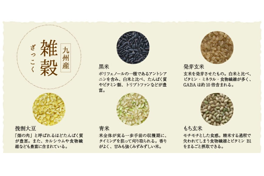 もち麦(九州産)、丸麦、押麦、もち玄米、紫芋、かぼちゃ、にんじん、挽割大豆、黒米、青