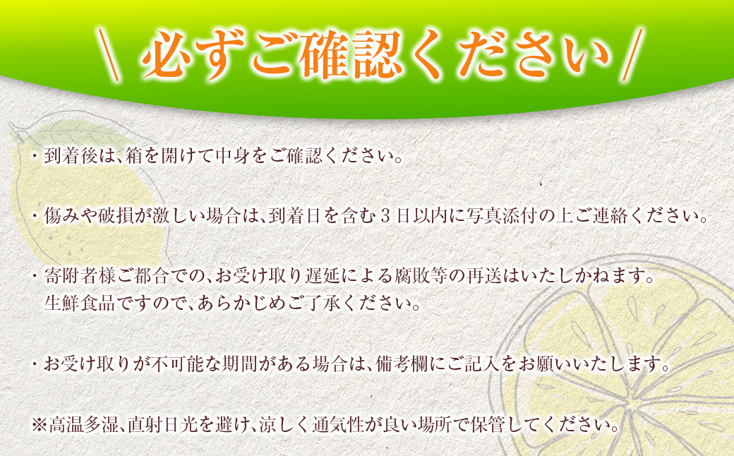※到着後は、必ず箱を開けて中身をご確認いただき、万が一ひどい傷み等がある場合は、到着日を含む3日以内に写真添付の上お問い合わせください。