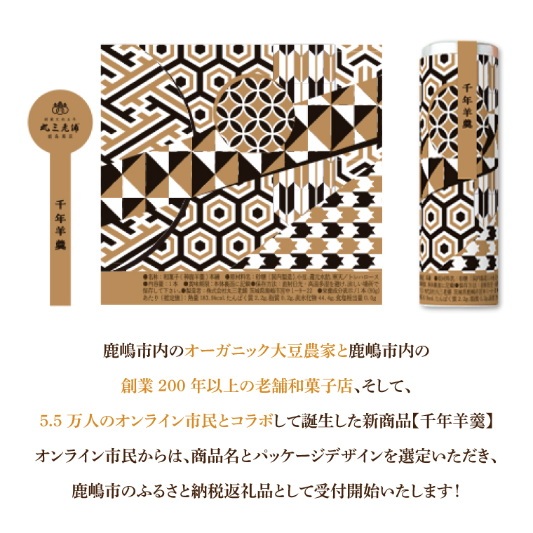 鹿嶋市内のオーガニック大豆農家と鹿嶋市内の創業 200 年以上の老舗和菓子店、そして、5.5 万人のオンライン市民とコラボして誕生した新商品【千年羊羹】