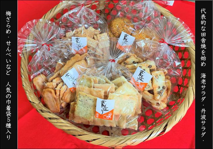 【田舎焼】餅米(国産)、海老、青のり、金ごま、黒ごま、食塩/着色料(紅麹)、(一部にえび・ごま含む)