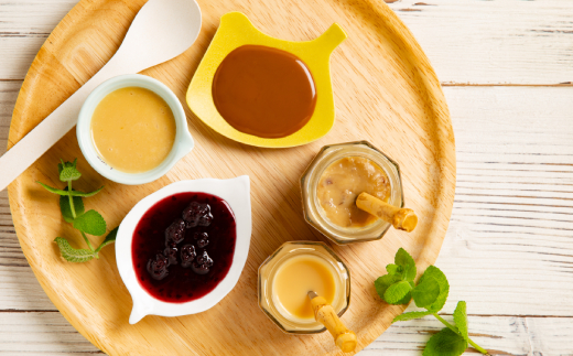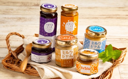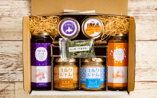 つぶつぶソース(ブラックベリー)160g×1、ミルクソース(キャラメル)160g×1、ミルクジャム(オホーツクの塩)130g×1、ミルクジャム(くるみ)130g×1、ミルクジャム(キャラメル)70g×1、ジャム(ブラックベリー)70g×1、ハーブティー(ハマナスローズヒップとハッカ)×1
