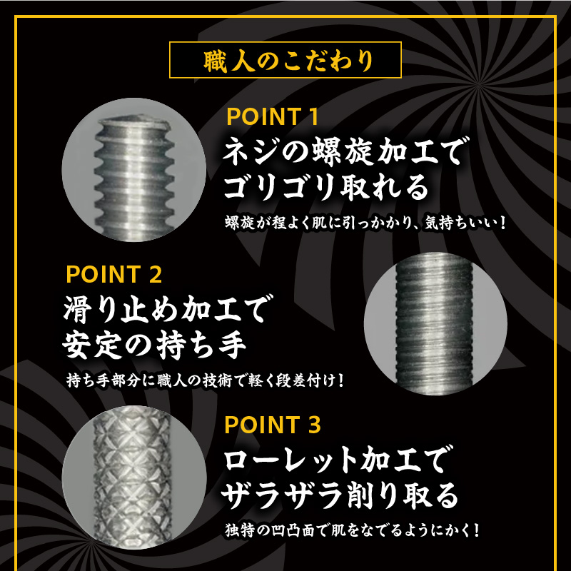 日本の職人による手作業で作成されたチタン製の耳かきです。転造(てんぞう)加工と呼ばれる金属加工を施しており、強度と見た目の綺麗さを両立しつつ、普段の耳かきでは味わうことのできない「新感覚のかき心地」を楽しむことができます。