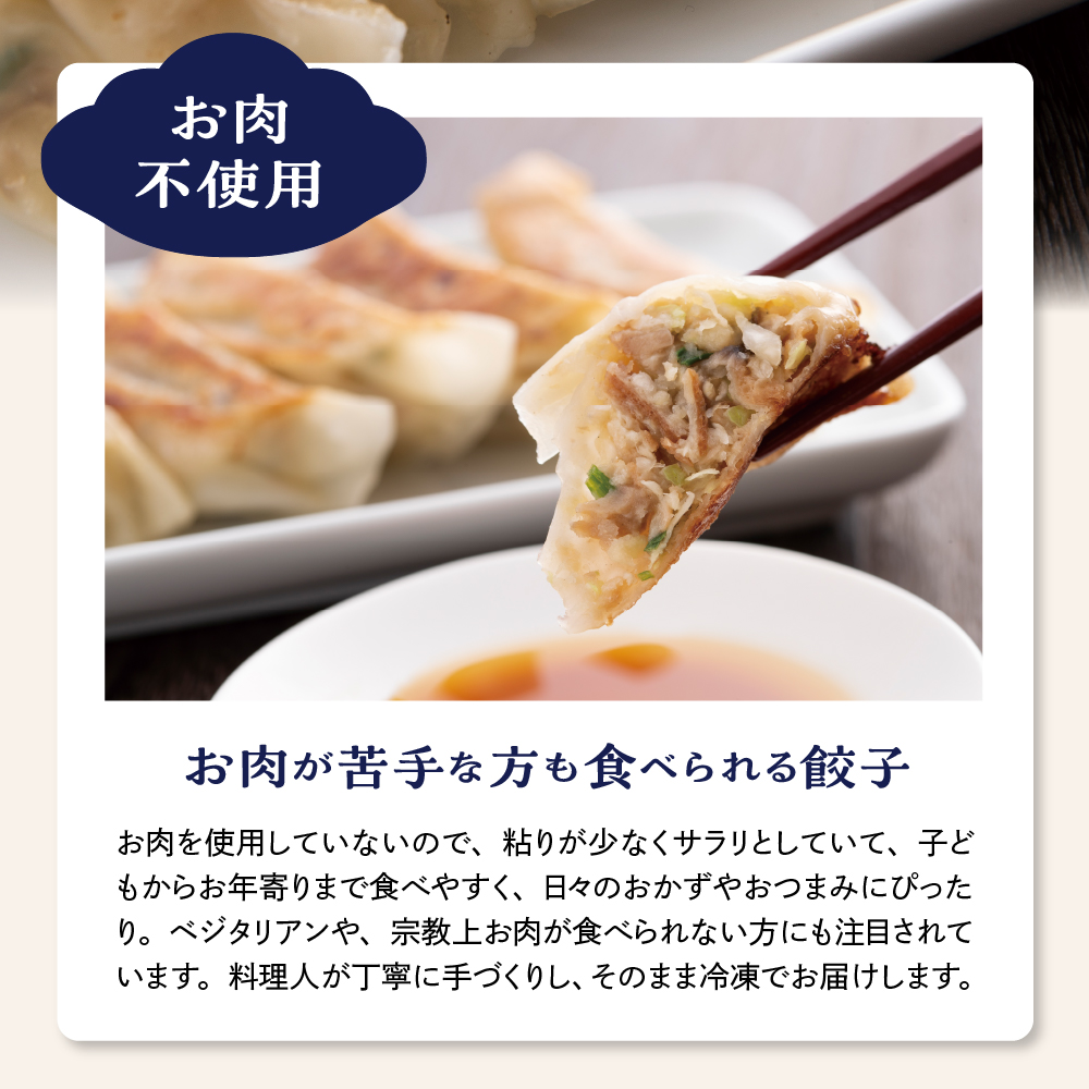 ベジタリアンや、宗教上お肉が食べられない方にも注目されています。料理人が丁寧に手づくりし、そのまま冷凍でお届け。自宅の定番メニューに、そしてご当地餃子として旅の話題と一緒にお土産にもどうぞ。