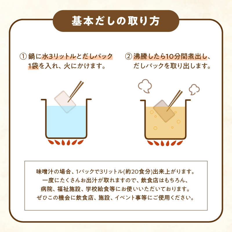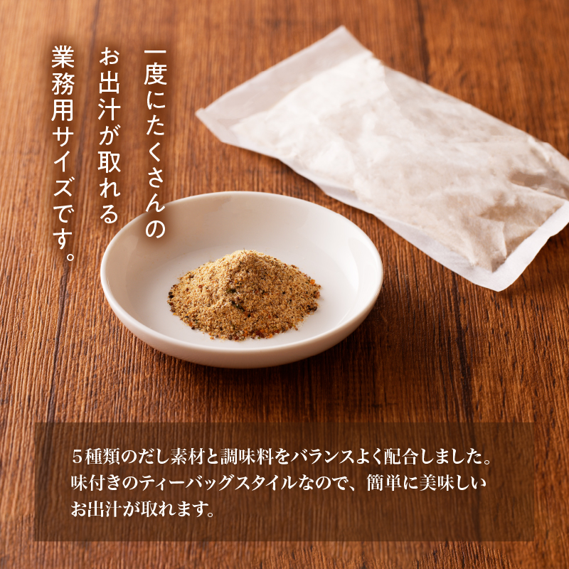 5種類の素材「かつお」「そうだかつお」「さば」「いわし煮干し」「昆布」と調味料をバランスよく配合しただしパックです。