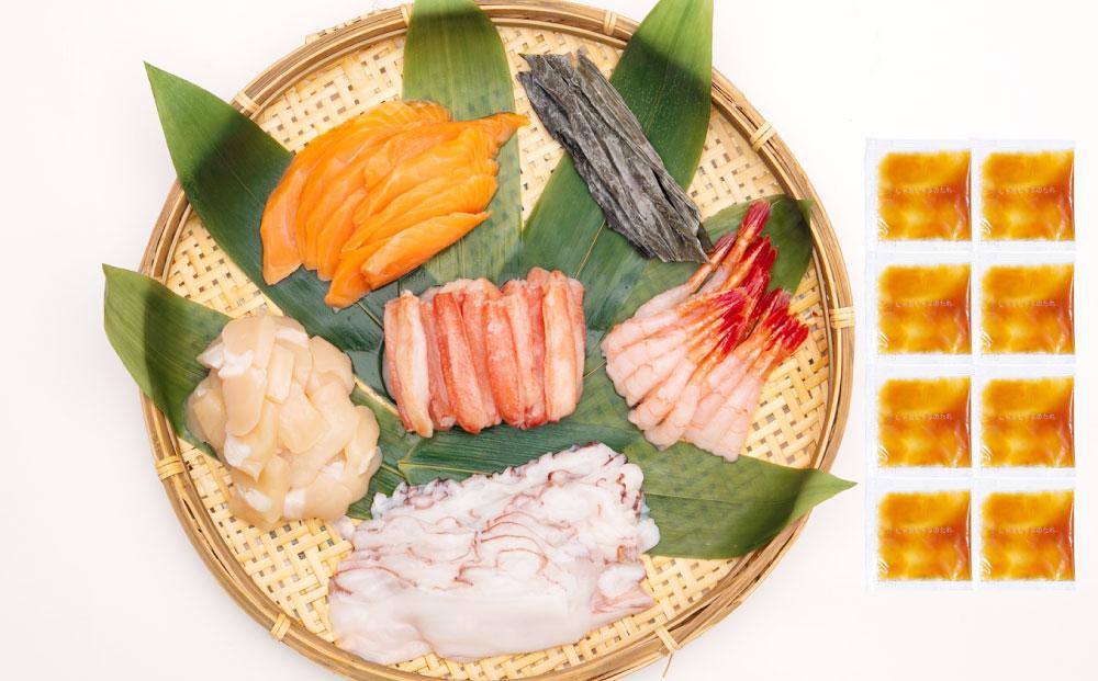 生ずわいがに棒ポーション300g、たこスライス100g×3、生甘海老(尾付むき海老)10本×2、生帆立貝柱スライス100g×3、トラウトサーモンスライス100g×2、だし用昆布5g×2、しゃぶしゃぶ用たれ15g×8