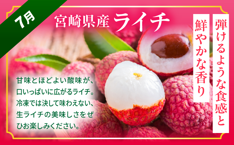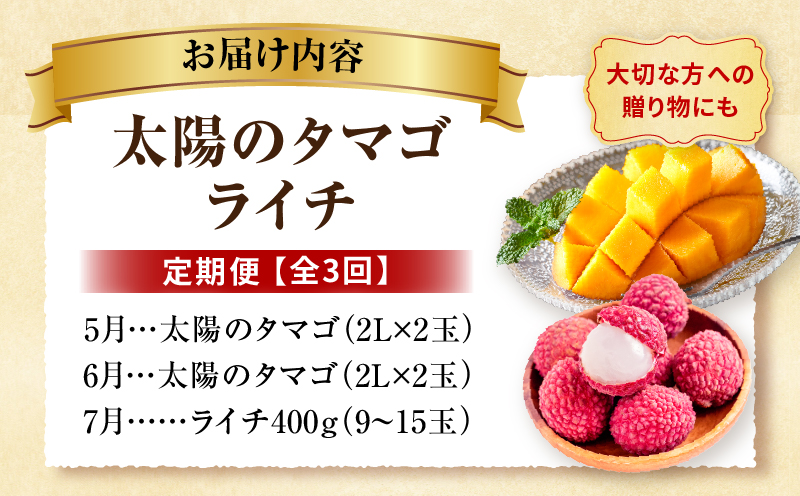 「太陽のタマゴ・ライチ定期便」は宮崎を代表する果物の王様『太陽のタマゴ』、楊貴妃がこよなく愛したとされている『ライチ』を全3回に渡りお届けする定期便。