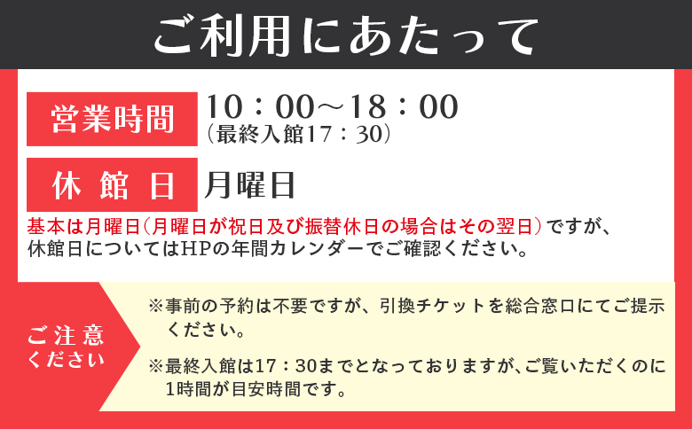 ※最終入館は17:30までとなっておりますが、ご覧いただくのに1時間が目安時間です。