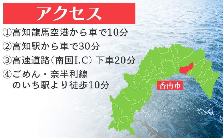 ①高知龍馬空港から車で10分 ②高知駅から車で30分 ③高速道路(南国I.C)下車20分 ④ごめん・奈半利線 のいち駅より徒歩10分