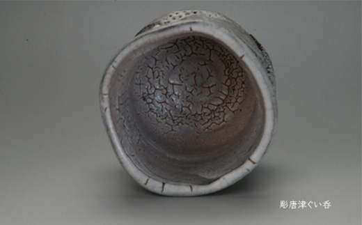 彫唐津ぐい呑です。鋭い彫をほどこしたぐい呑。高台は2重高台に仕立てました。