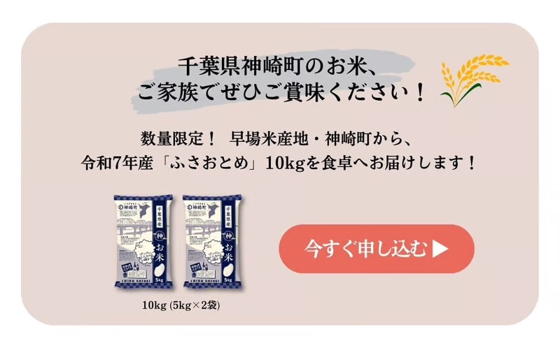 千葉県北東部に位置する神崎町から、初めての取り組みで、ふるさと納税返礼品が登場!利根川の豊かな水と肥沃な土壌に恵まれた神崎町は、江戸時代から続く米どころとして知られています。特に香取地域は日本有数の早場米産地として名高く、どこよりも早くお米の味わいをお届けできます。令和7年9月以降、収穫でき次第順次発送いたします。