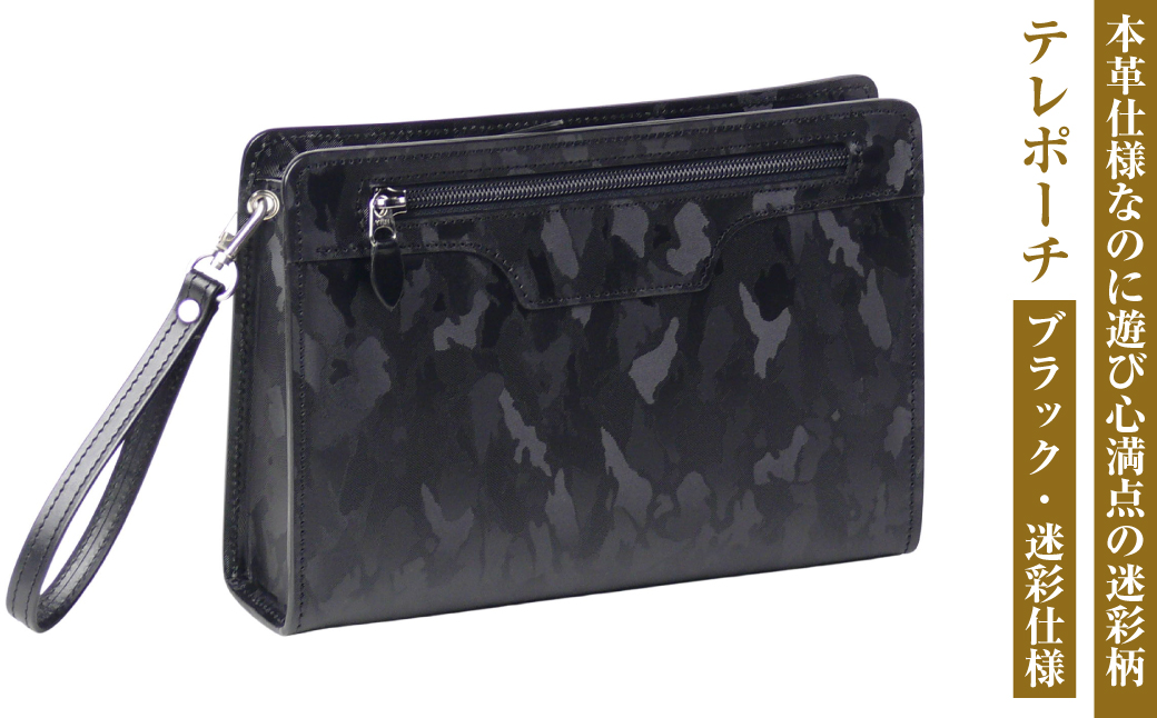 【日本製の安心感】創業50年の実績と日本製の安心感!!オーダーメイドで培った技術を駆使した、淡路かばん工房の熟練の鞄職人の手による、携帯電話ポケット標準装備のメンズ仕様ポーチ。革の表面に型押し・特殊加工で迷彩柄を施した、カジュアルなセカンドバッグ。