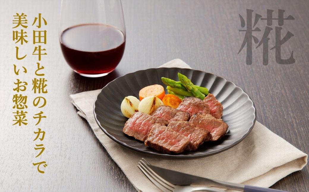 米、大麦などで育てた味のある鹿児島県産黒毛和牛「小田牛」のモモ肉に、こうじのチカラを加えました。