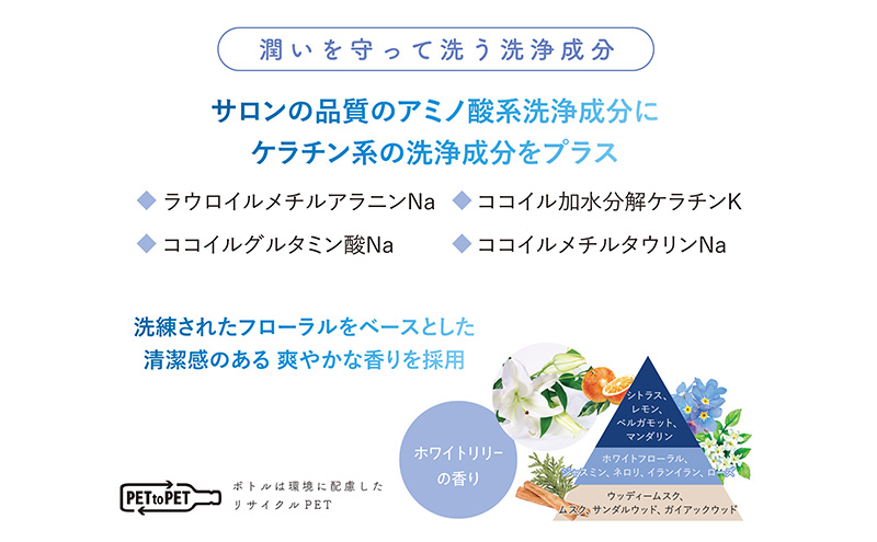 シャンプーはアミノ酸とケラチン系洗浄成分をバランスよく配合し潤いながら優しく洗います。