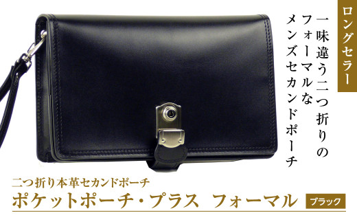 そのどちらでもない2つ折り長財布のようなデザインのポケットポーチ・プラスは、2つ折りを開いた時に収納口が大きく開き、中の物が取り出し易いポーチです。黒限定&シルバー仕様・金具標準装備のフォーマル(冠婚葬祭)向けの仕様です。