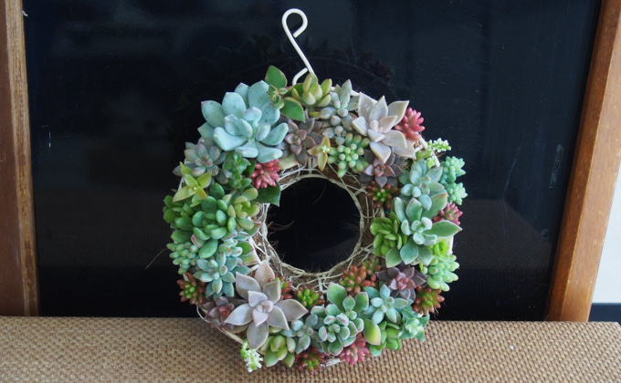 丸型リースに詰め込んだ多肉植物たちの多彩な色合い、質感を楽しめます。