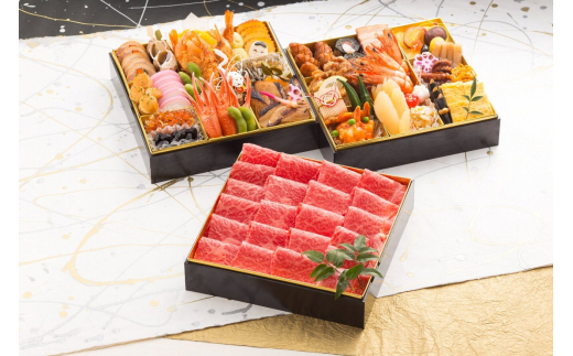 ●おせち料理三段(伊万里牛モモスライス400g一段、おせち料理二段)