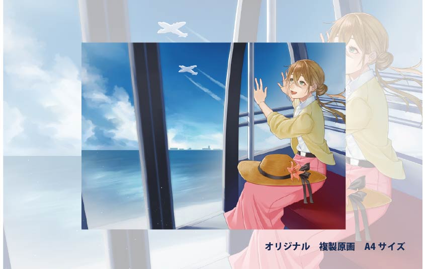 関西国際空港から飛び立つ飛行機を眺める風景を描いた1枚絵です。