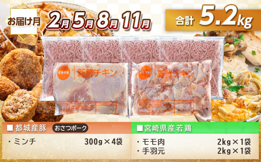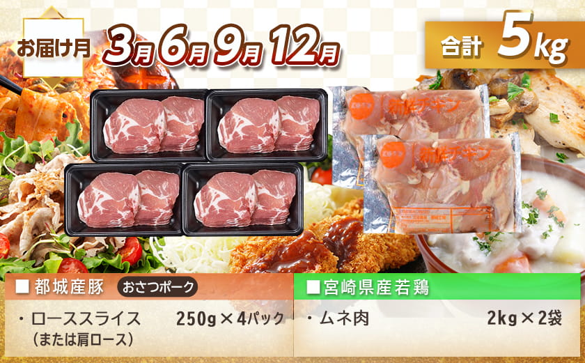 都城産ブランド豚「おさつポーク」と宮崎県産若鶏をセットにしました!ご入金翌月から2ヶ月に1回、計5回お届けいたします。
