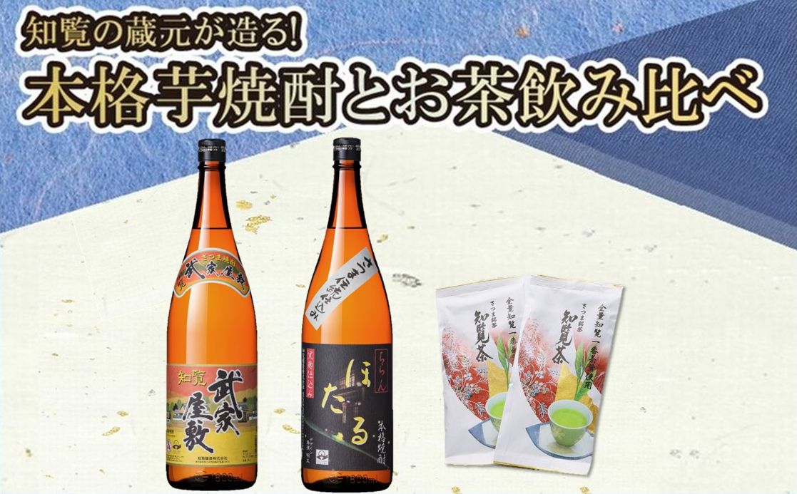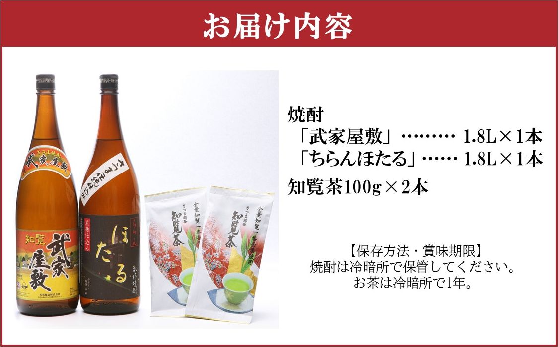 「ちらんほたる」・「武家屋敷」各1.8Lと知覧茶をセットでお届けいたします。