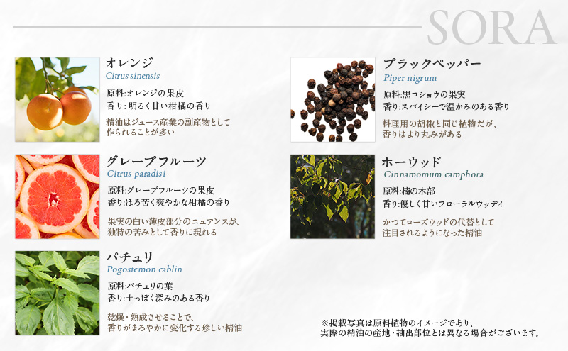 フレッシュな果物の中にあるスパイスの効いたブラックペッパーの精油によって、気分転換になる香りに仕上がりました。