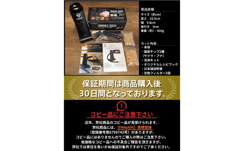 スモークリッチは、熱源を必要とせず、短時間で簡単に冷燻が楽しめます。お好みのチップ(お試しチップ2種付属、国産のサクラチップとブナチップが付属)と単三電池2本(電池別売り)で動作し、熱源不要で燻製を開始でき、安全性と耐久性に優れています。