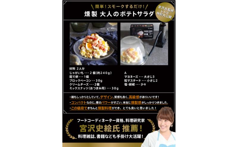 燻製の料理を手軽に楽しむために設計され、ワンランク上の食事を楽しむための「燻製器 スモークリッチ」。冷燻法を簡素化したスモーカー燻製器で、燻製の香りを素早く食材に漂わせてくれます。手軽さ、スピード、手間いらずが特徴で、たった5分で自宅やアウトドアで本格的な燻製料理を楽しむことができます。