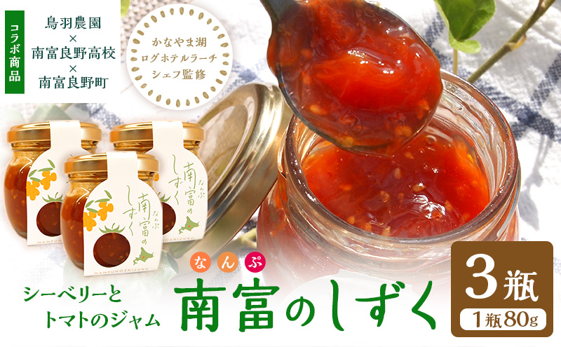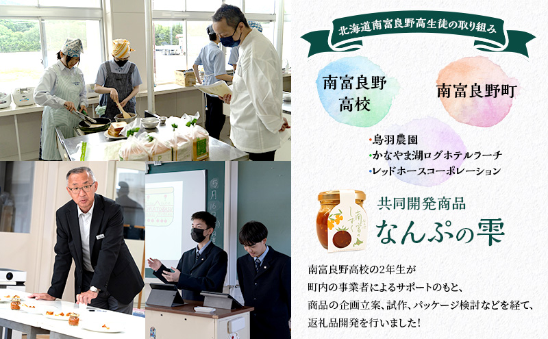 南富良野町×南富良野高校高校×鳥羽農園×レッドホースコーポレーション(株)による「産官学連携によるふるさと納税共創プロジェクト」で開発された新商品ジャム「南富のしずく」。