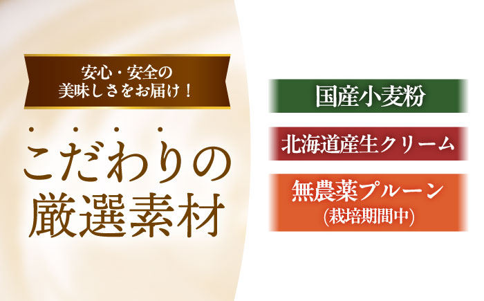 小麦粉(スーパーバイオレット薄力粉)、たまご、グラニュー糖、北海道生クリーム(乳脂肪分45%)、ラム酒(マイヤーズ)、無農薬プルーン、オレンジ、オーガニックバニラビーンズ、粉砂糖
