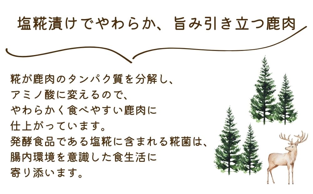 糀が鹿肉のタンパク質を分解しアミノ酸に変えるので、柔らかく食べやすい鹿肉に仕上がっています。発酵食品である塩糀は腸内環境を意識した食生活に寄り添います。