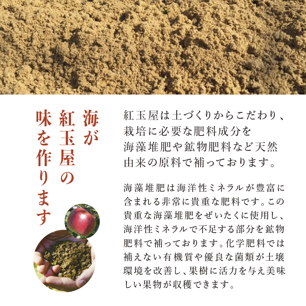 紅玉屋は土づくりからこだわり、栽培に必要な肥料成分を海藻堆肥や鉱物肥料など天然由来の原料で補っております。海藻堆肥は海洋性ミネラルが豊富に含まれる非常に貴重な肥料です。この貴重な海藻堆肥をぜいたくに使用し、海洋性ミネラルで不足する部分を鉱物肥料で補っております。