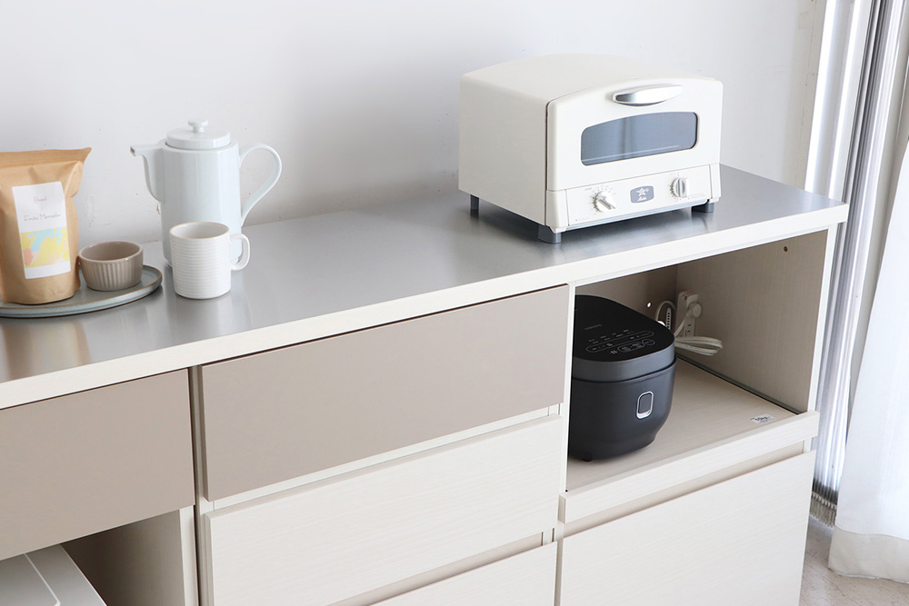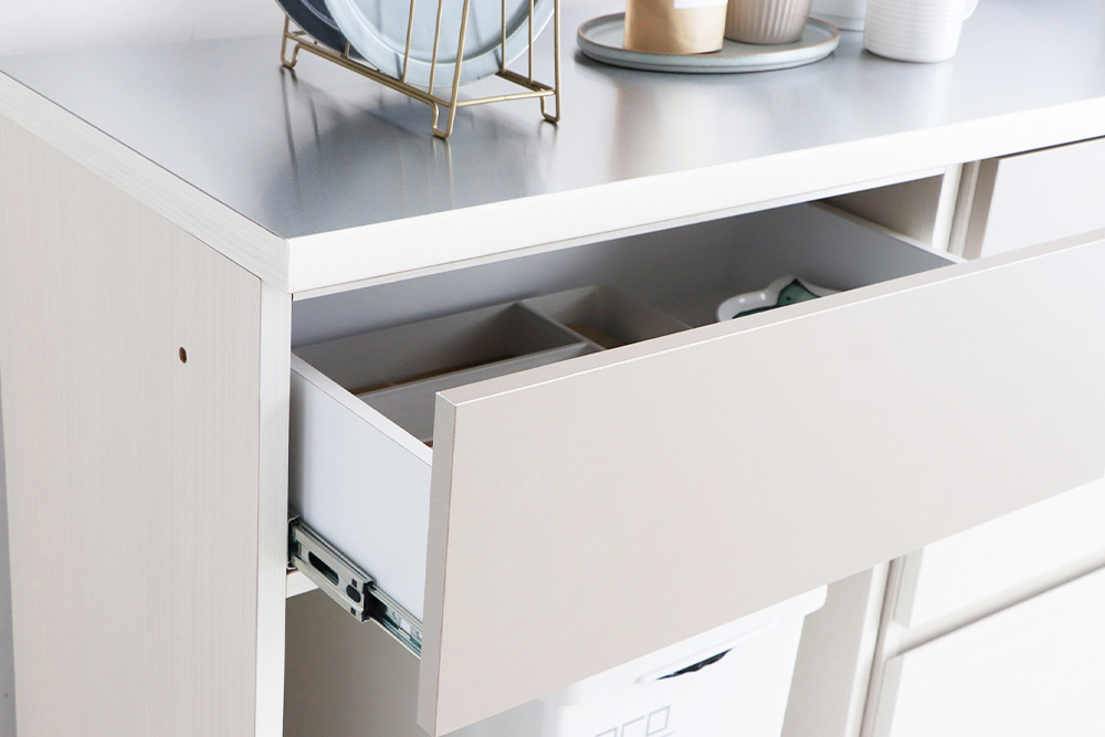 深浅の引き出し構成で、食器・カトラリー・キッチン雑貨をひとまとめに整理。