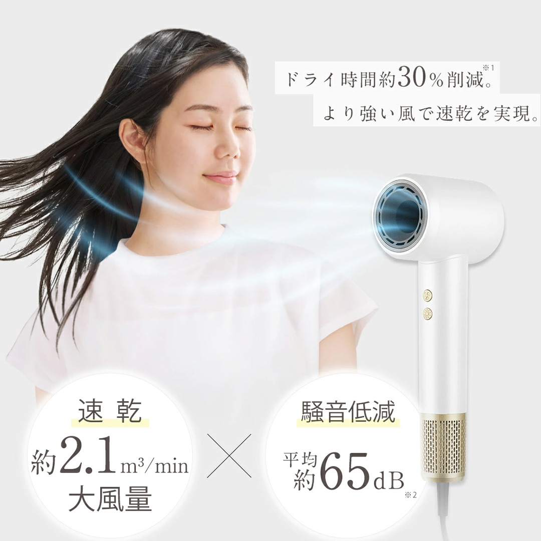 ヘアドライヤーの吹出口に搭載した1立法cmあたり約2億個の高濃度マイナスイオンが髪の潤いを守り、静電気を抑えることで、毛芯に水分を浸透させて潤いを与えます。
