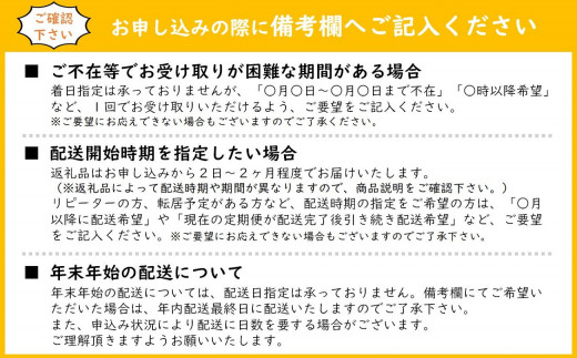 ・配達希望日のご指定は受け付けておりませんが、備考欄にご希望の時期やご不在の日を記載いただくと、可能な限り対応させていただきます。