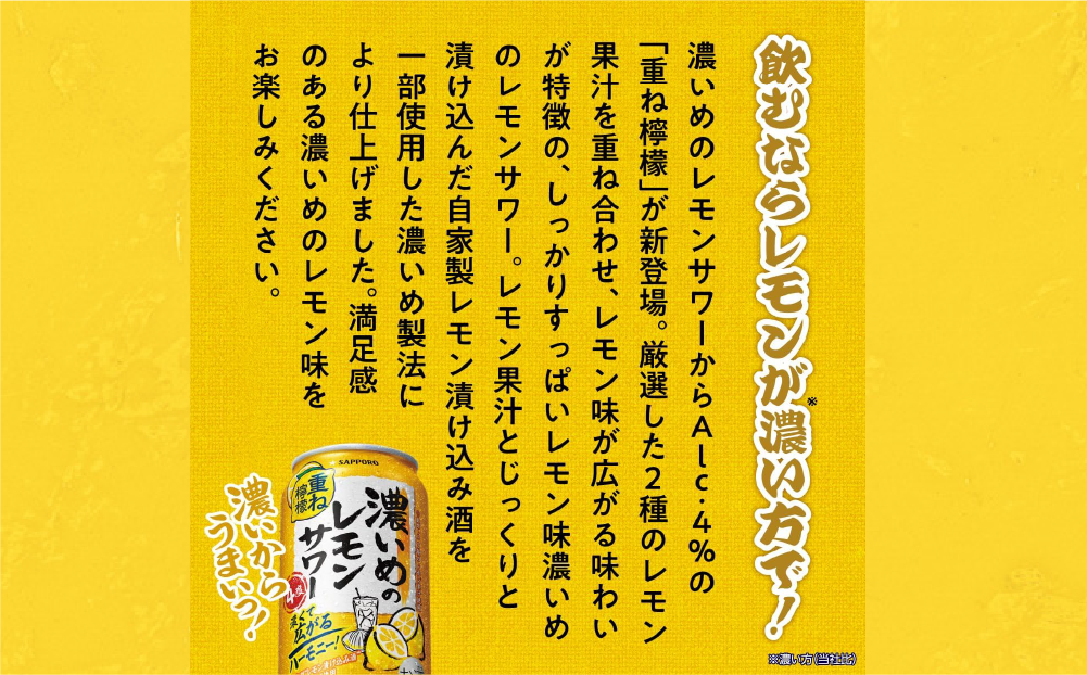 レモン果汁とじっくりと漬け込んだ自家製レモン漬け込み酒を一部使用した'濃いめ製法'により仕上げました。満足感のある濃いめのレモン味をお楽しみください。
