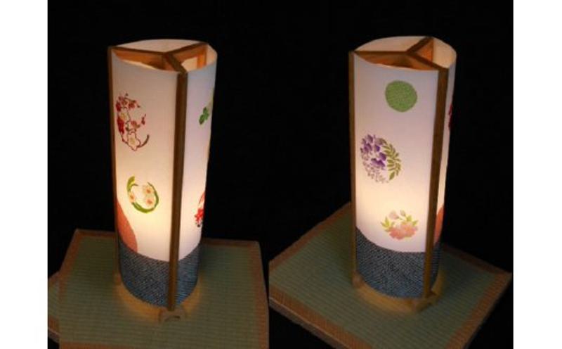 塩ビプレートの上に和紙を貼り、その上に絹の着物生地を貼っています。柄の部分は絹の着物生地のみを使って構成してあります。(絹の生地で画面上に絵を描くように、色や風合いの合った生地を選び、それぞれの形に切って約0.5mm重ねて組み合わせて貼っています。)絹は電球の光を程よく通すため、より一層あざやかに見えます。着物生地でしか表せない風情あるおもむきを楽しんでいただければ幸いです。